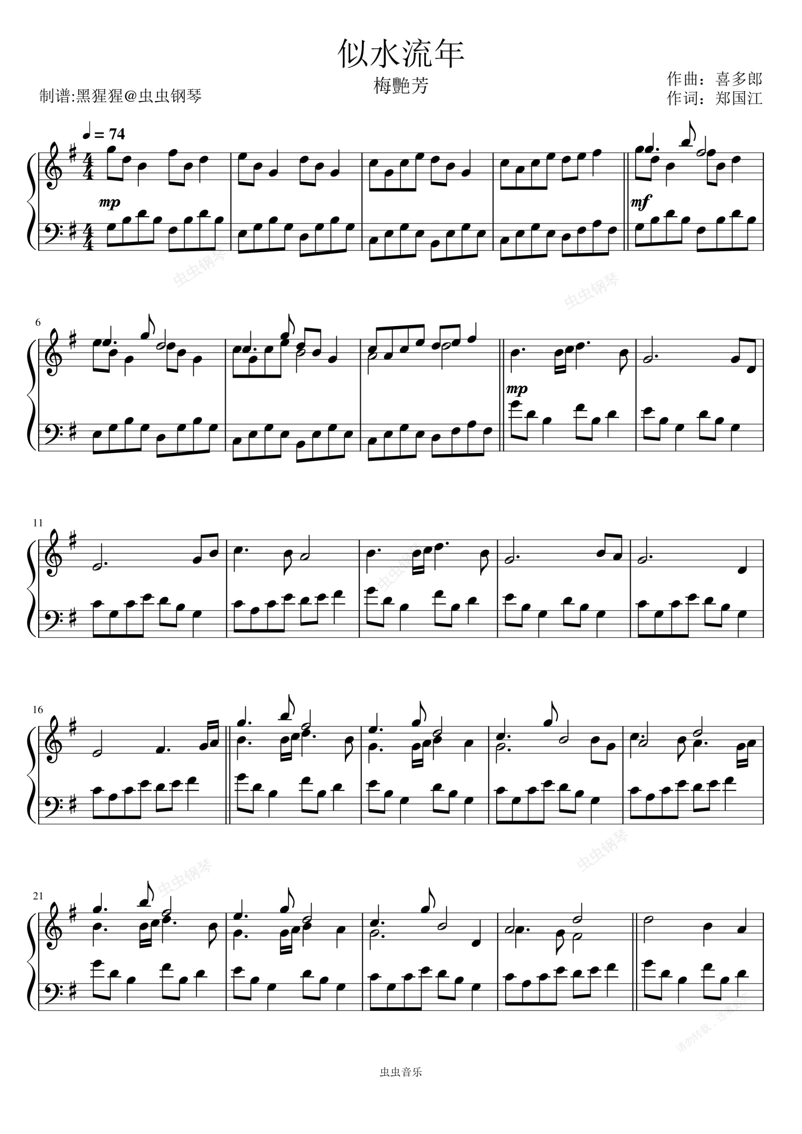钢琴谱:梅艳芳-G调 《似水流年》