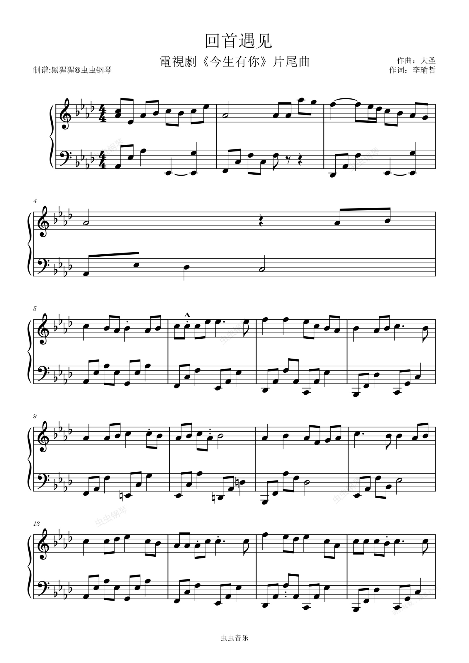 钢琴谱:苏诗丁-Ab调 《回首遇见》