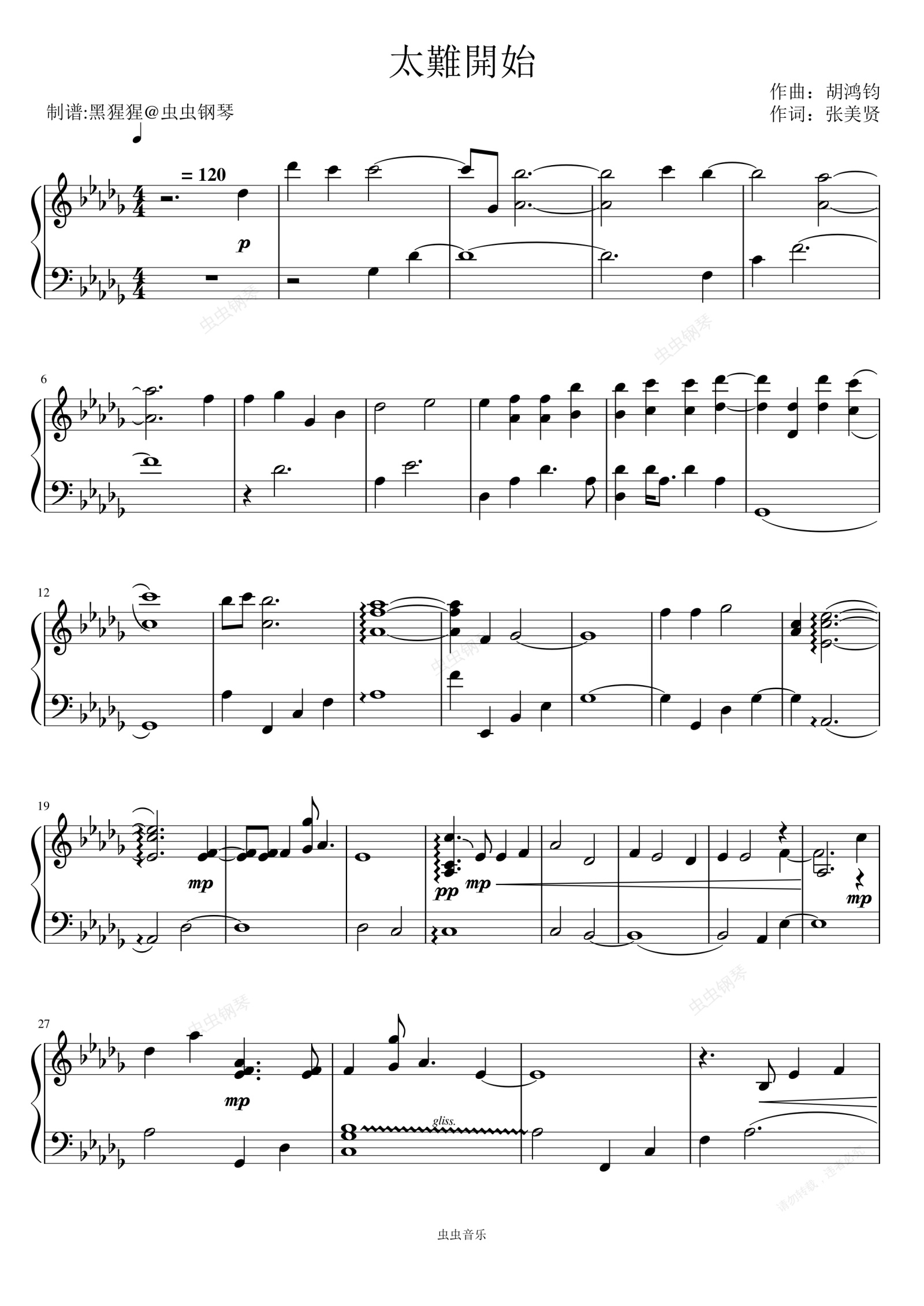 钢琴谱:胡鸿钧-Db调 《太难开始》