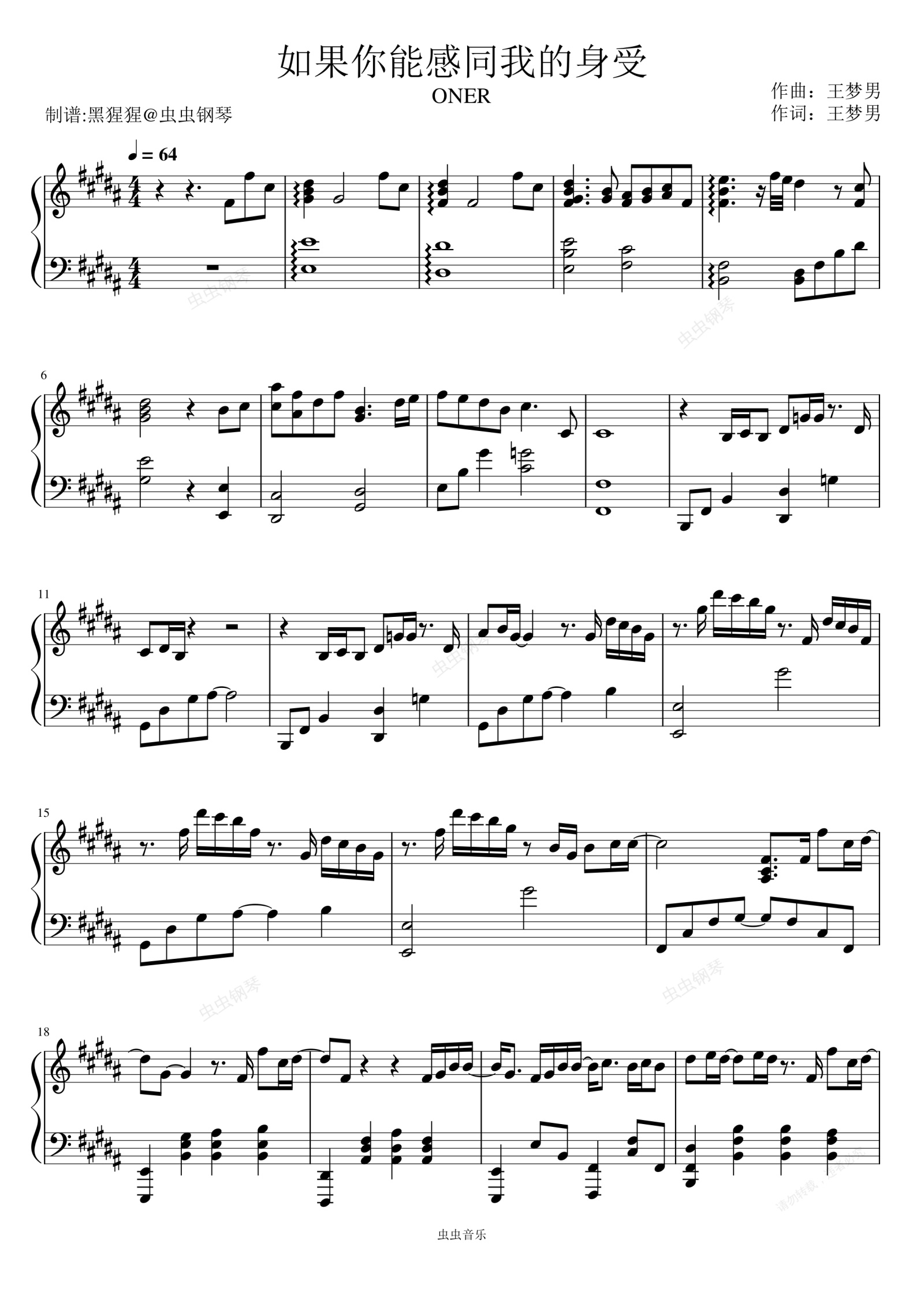 钢琴谱:ONER-B调 《如果你能感同我的身受》