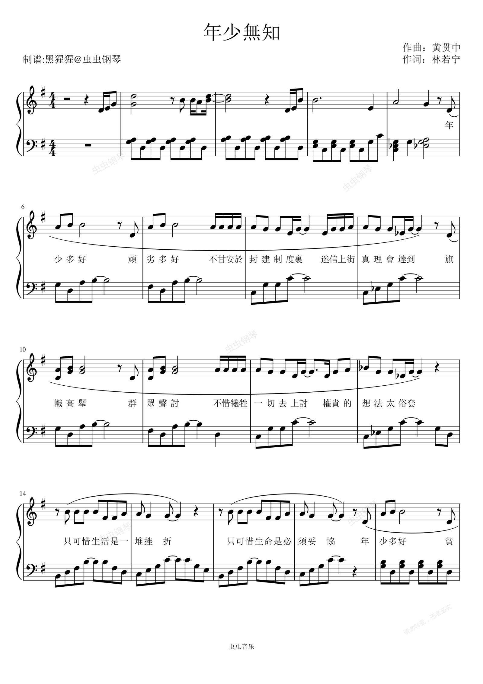 钢琴谱:林保怡、陈豪及黄德斌-G调 《年少无知》
