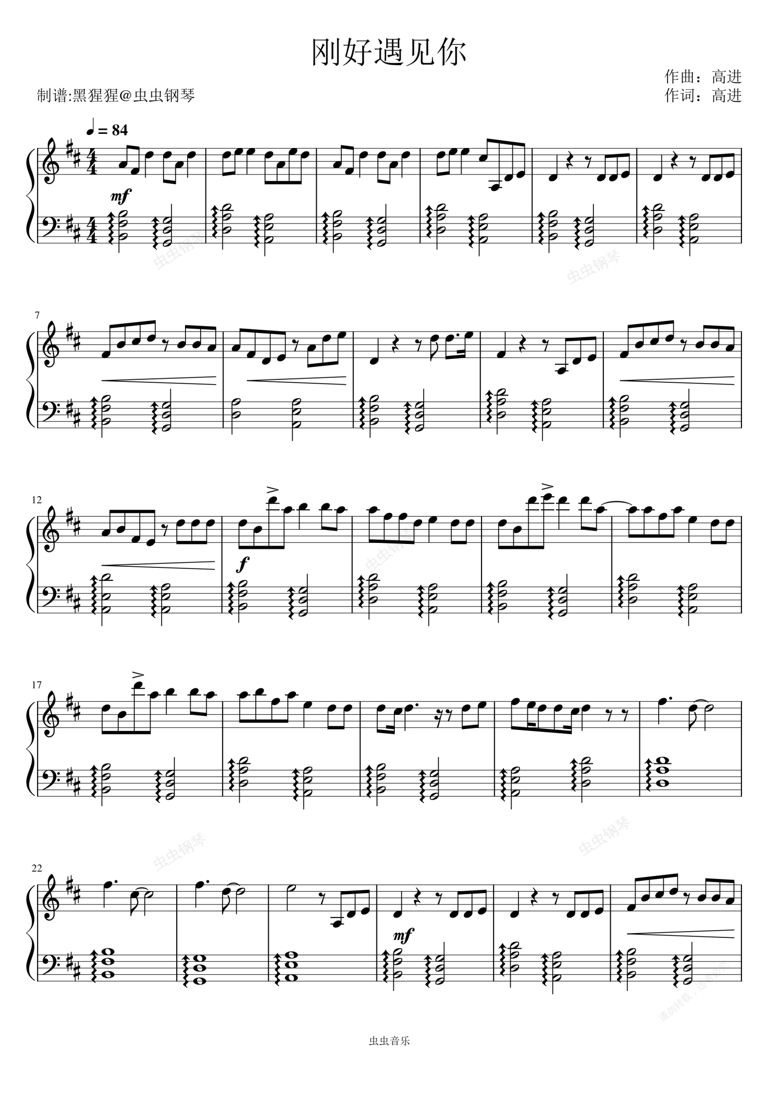 钢琴谱:李玉刚-D调 《刚好遇见你》