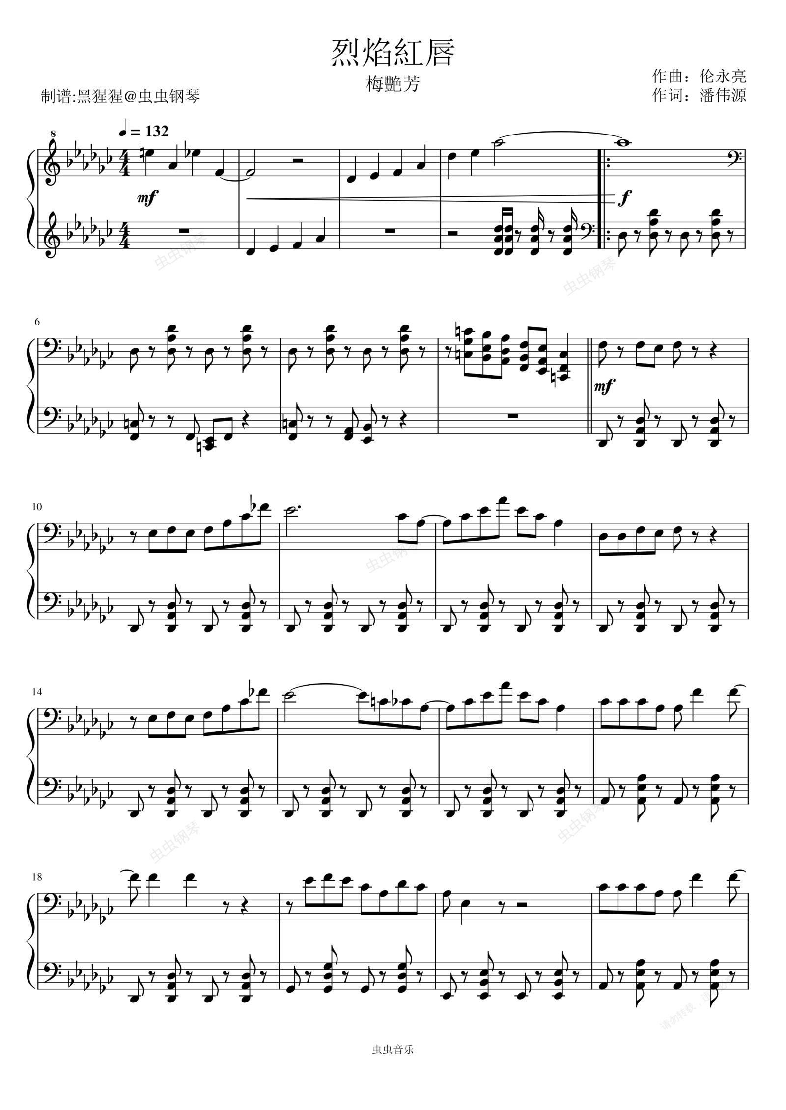 钢琴谱:梅艳芳-Gb调 《烈焰红唇》