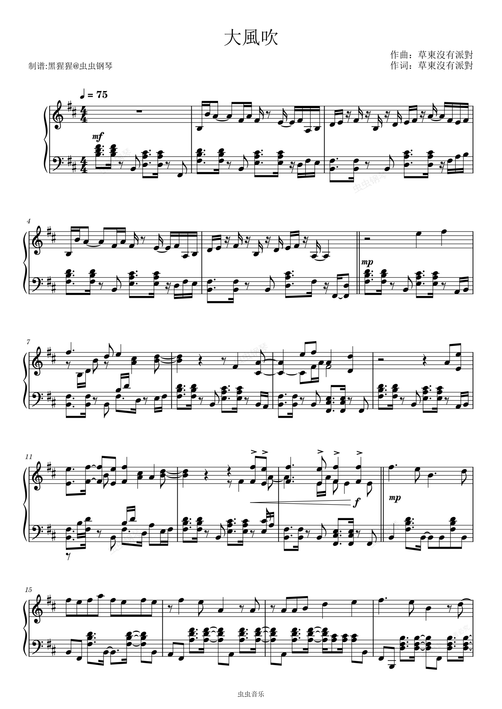 钢琴谱:草东没有派对-D调 《大风吹》