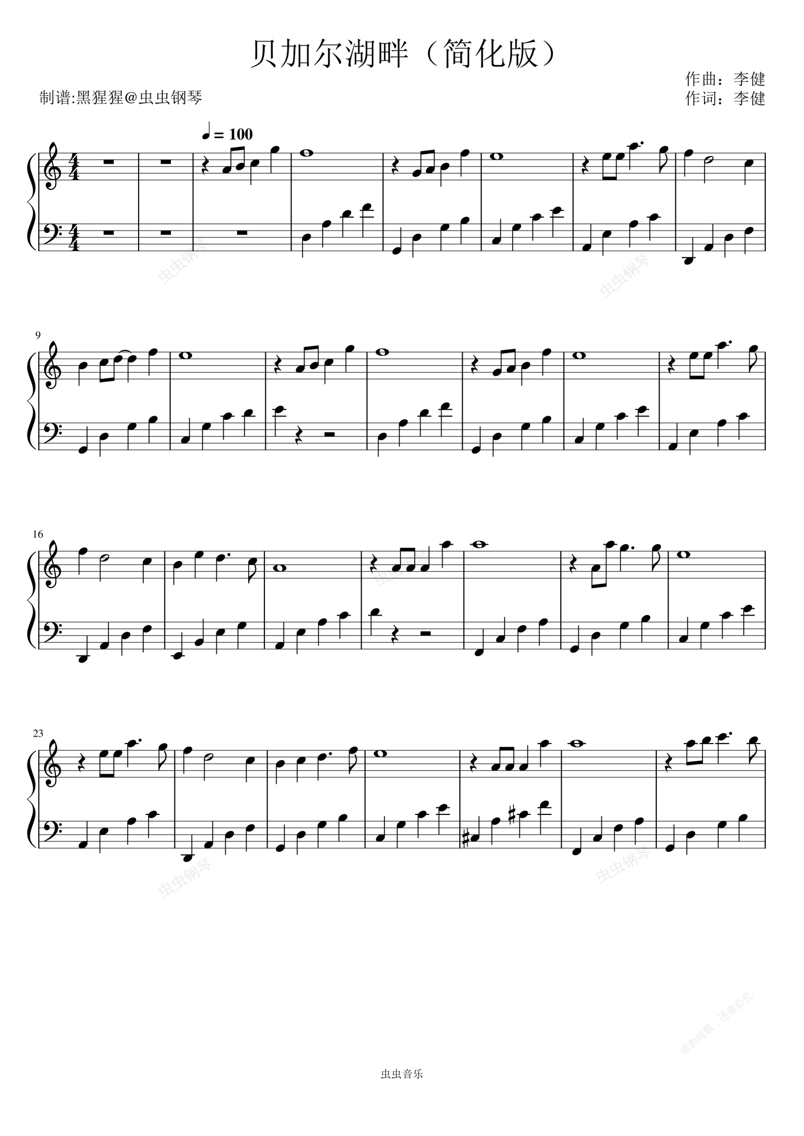 钢琴谱:李健-C调 《贝加尔湖畔(简化版)》