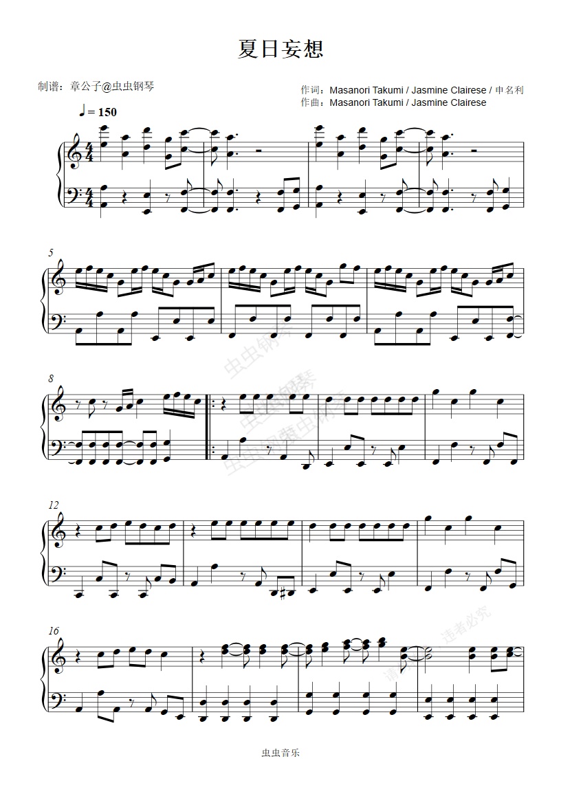 钢琴谱:夏日妄想 王者荣耀