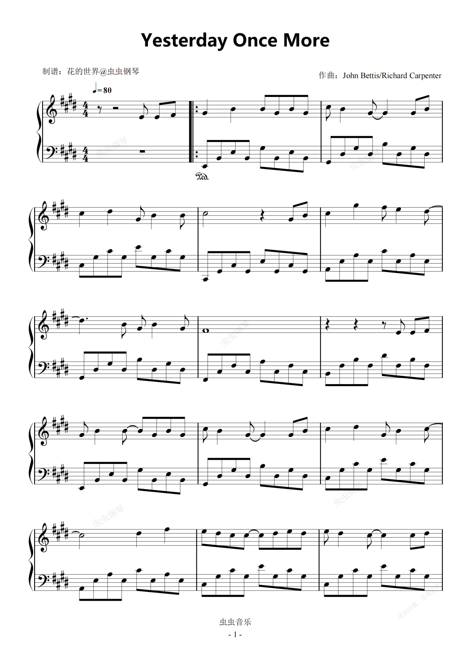 钢琴谱:昨日重现  yesterday once more  原调简易版 流行经典