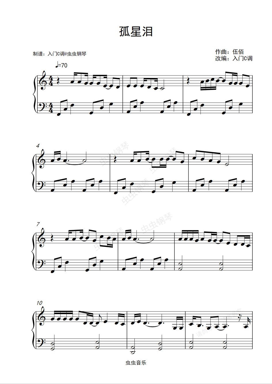 钢琴谱:【经典老歌】刘德华《孤星泪》入门C调简单版