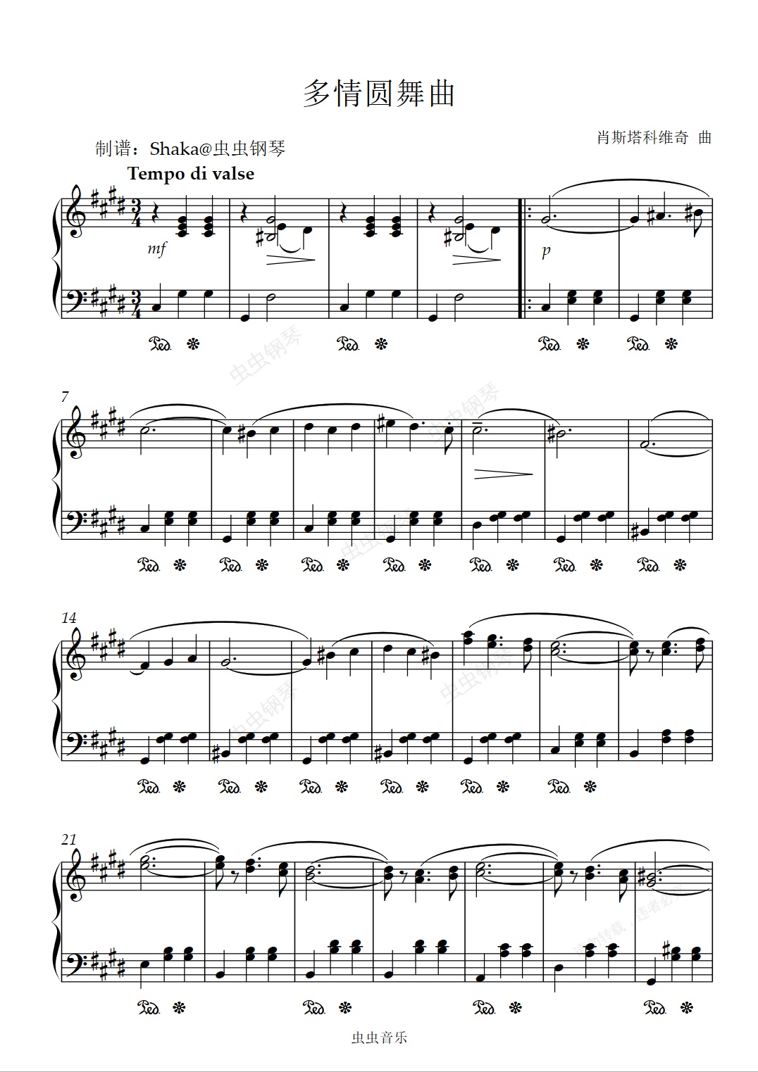 钢琴谱:多情圆舞曲升c调版 ZYY 考级曲目