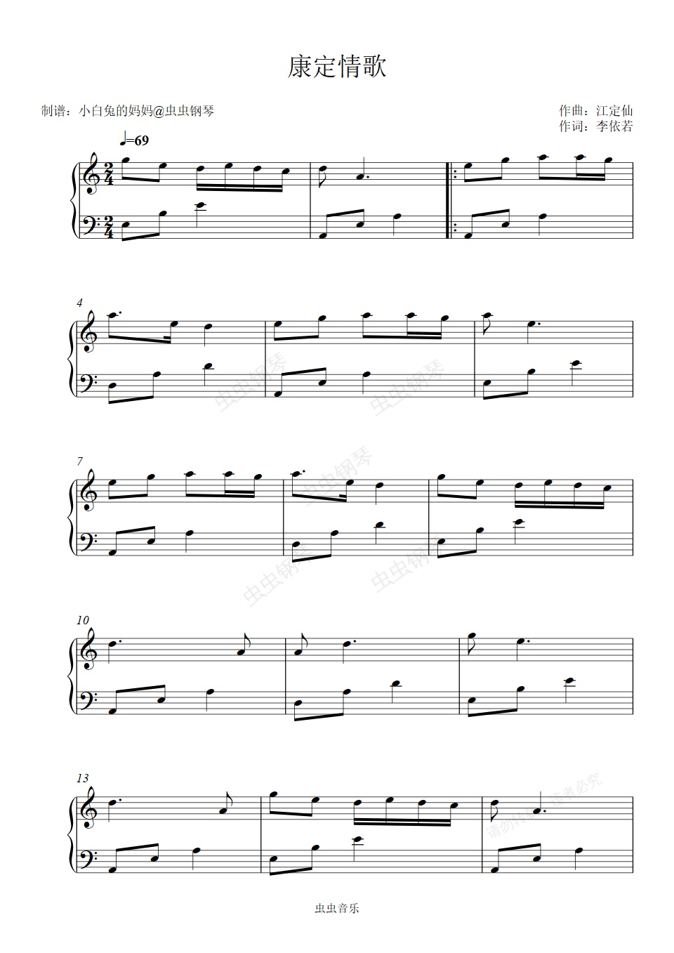 钢琴谱:《康定情歌》初学者版本