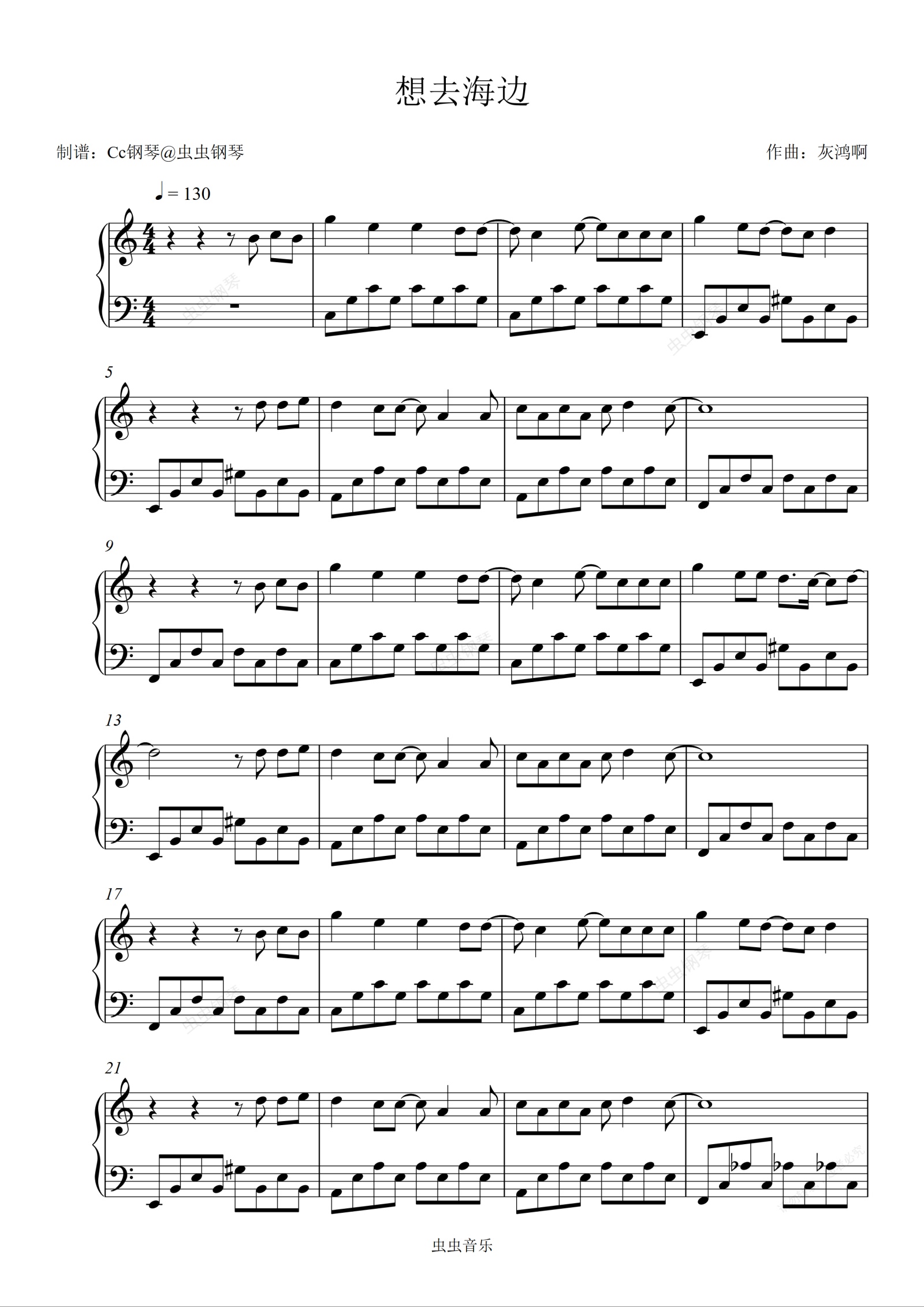 钢琴谱:想去海边 C调 好听易上手