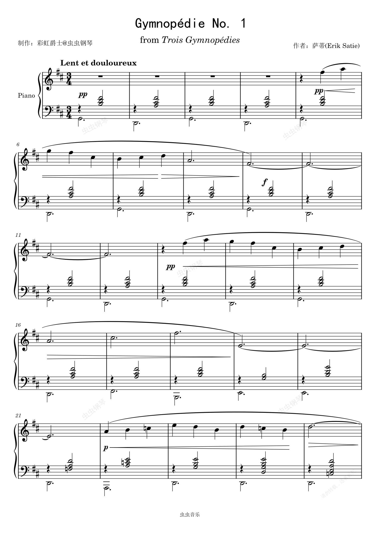 钢琴谱:Gymnopedie No. 1 完美版 萨蒂(Erik Satie) 裸体舞曲