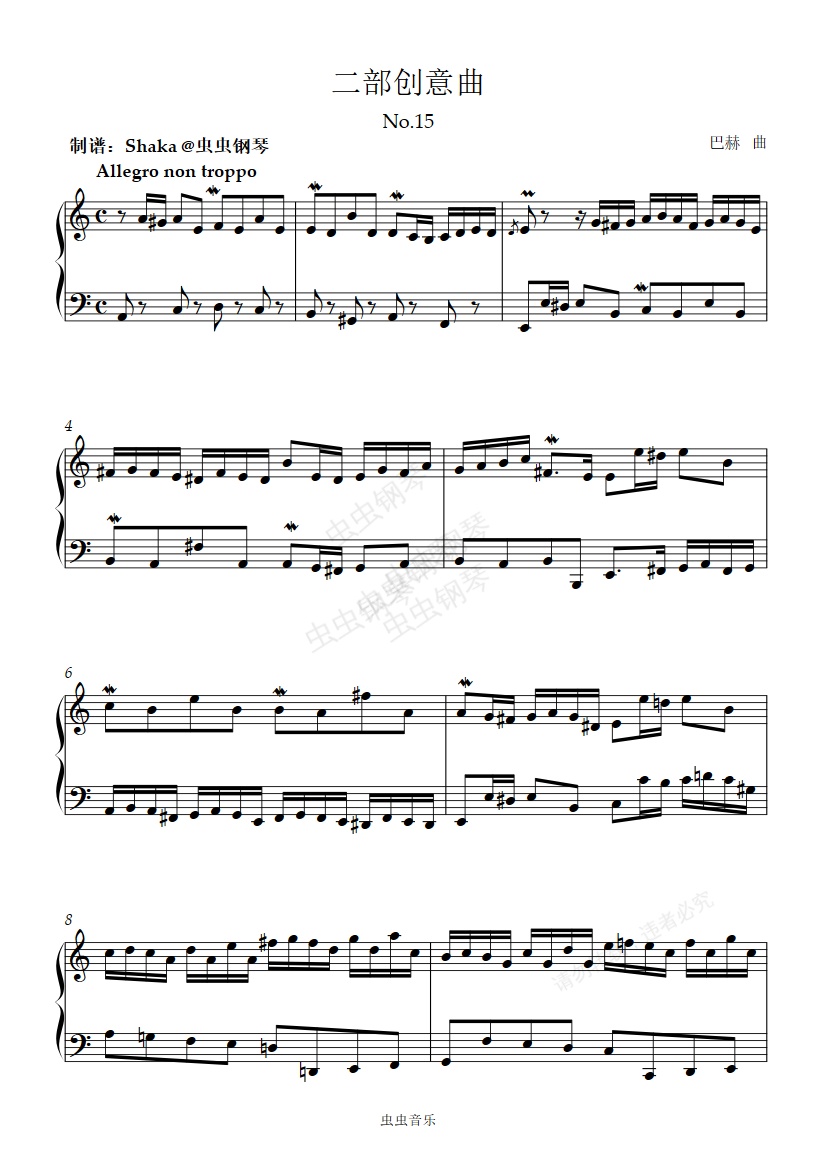 钢琴谱:巴赫 二部创意曲 No.15 C调版(a小调) ZYY 考级曲目