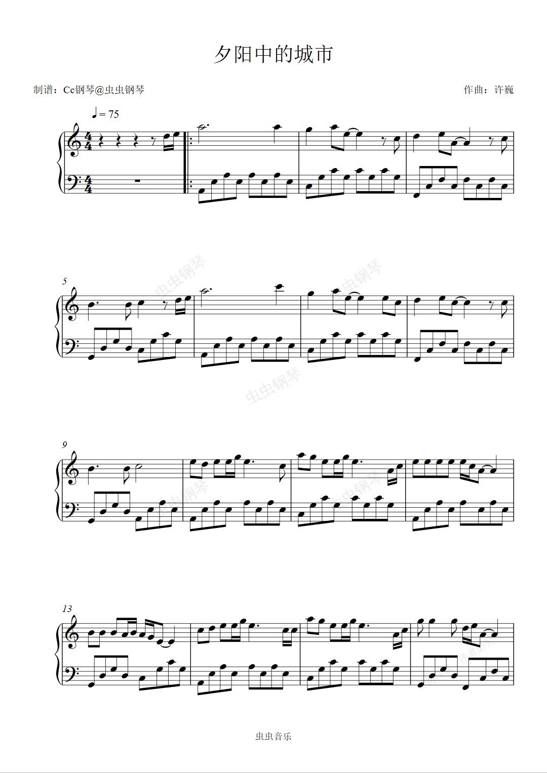 钢琴谱:夕阳中的城市 C调 好听易上手