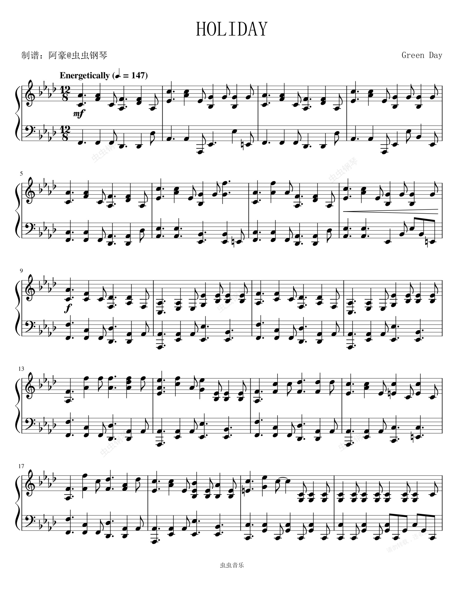 钢琴谱:Holiday - Green Day (绿日乐队)