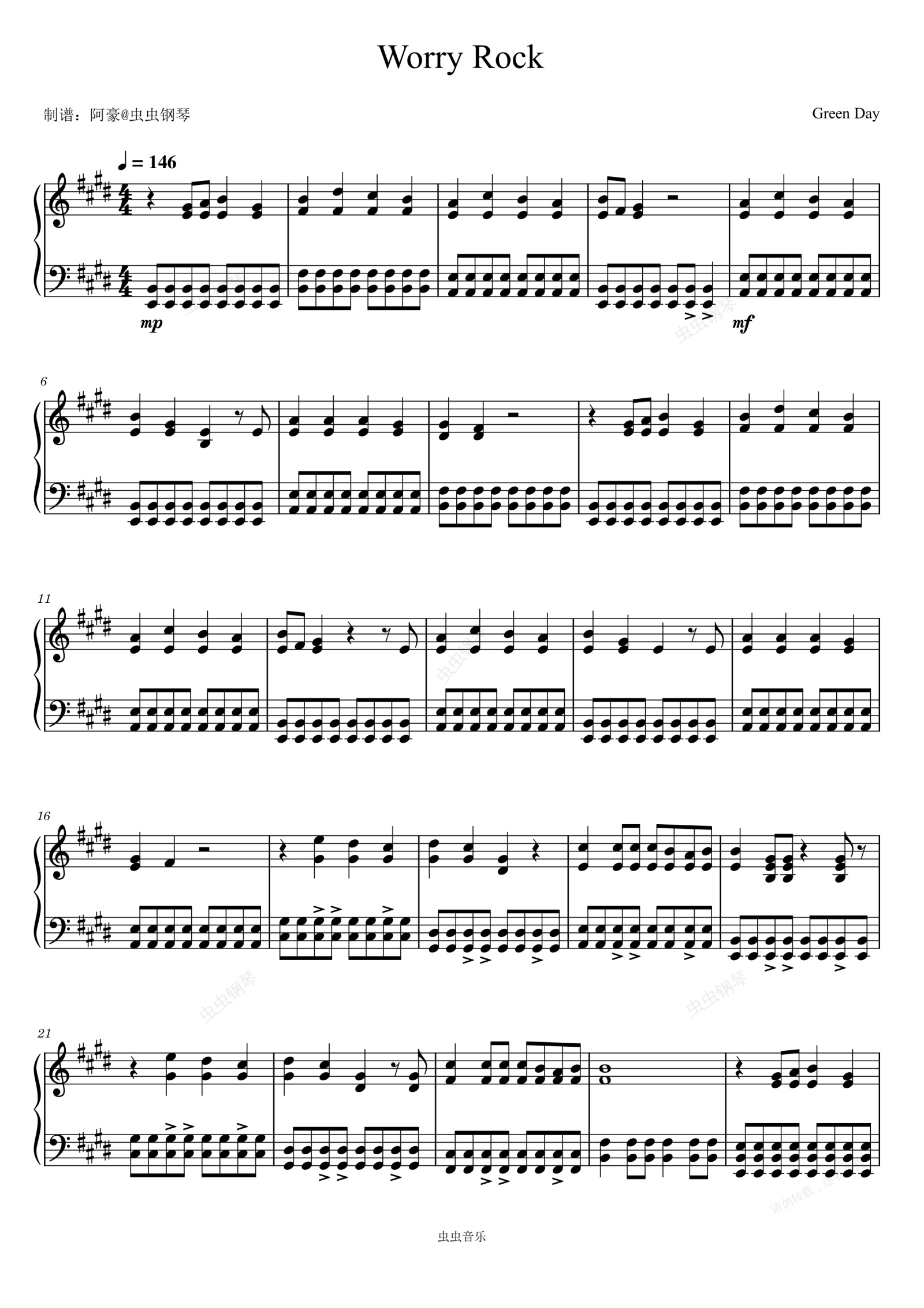 钢琴谱:Worry Rock - Green Day (绿日乐队)