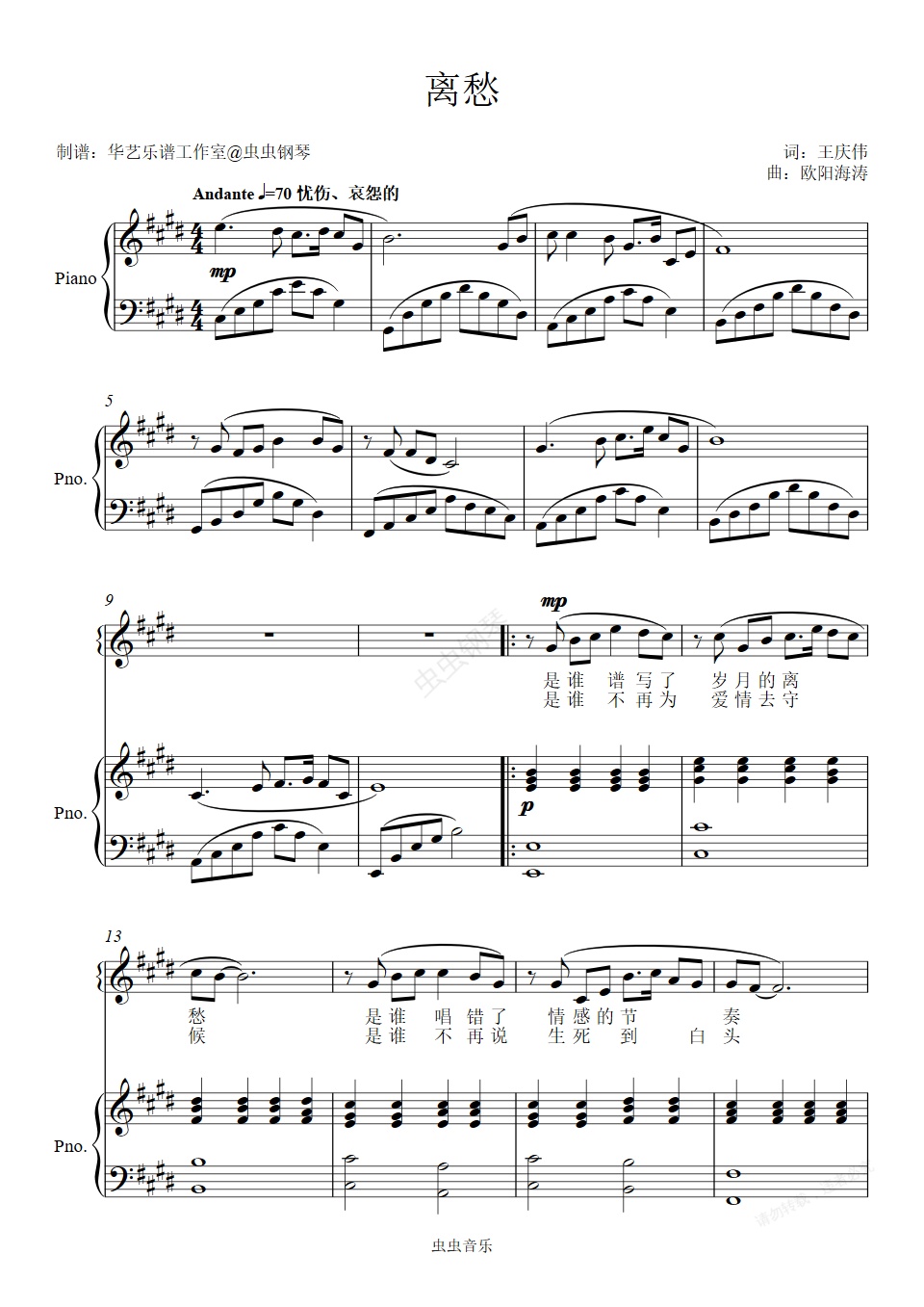 原创歌曲《离愁》表达了人世间的爱恨离愁的思想感情。钢琴弹唱速度可以快一点。基本中速。不定期更新原创钢琴弹唱作品。支持原创。王庆伟词,欧阳海涛曲。欧阳海涛,艺名,欧阳哲一。感谢您的青睐