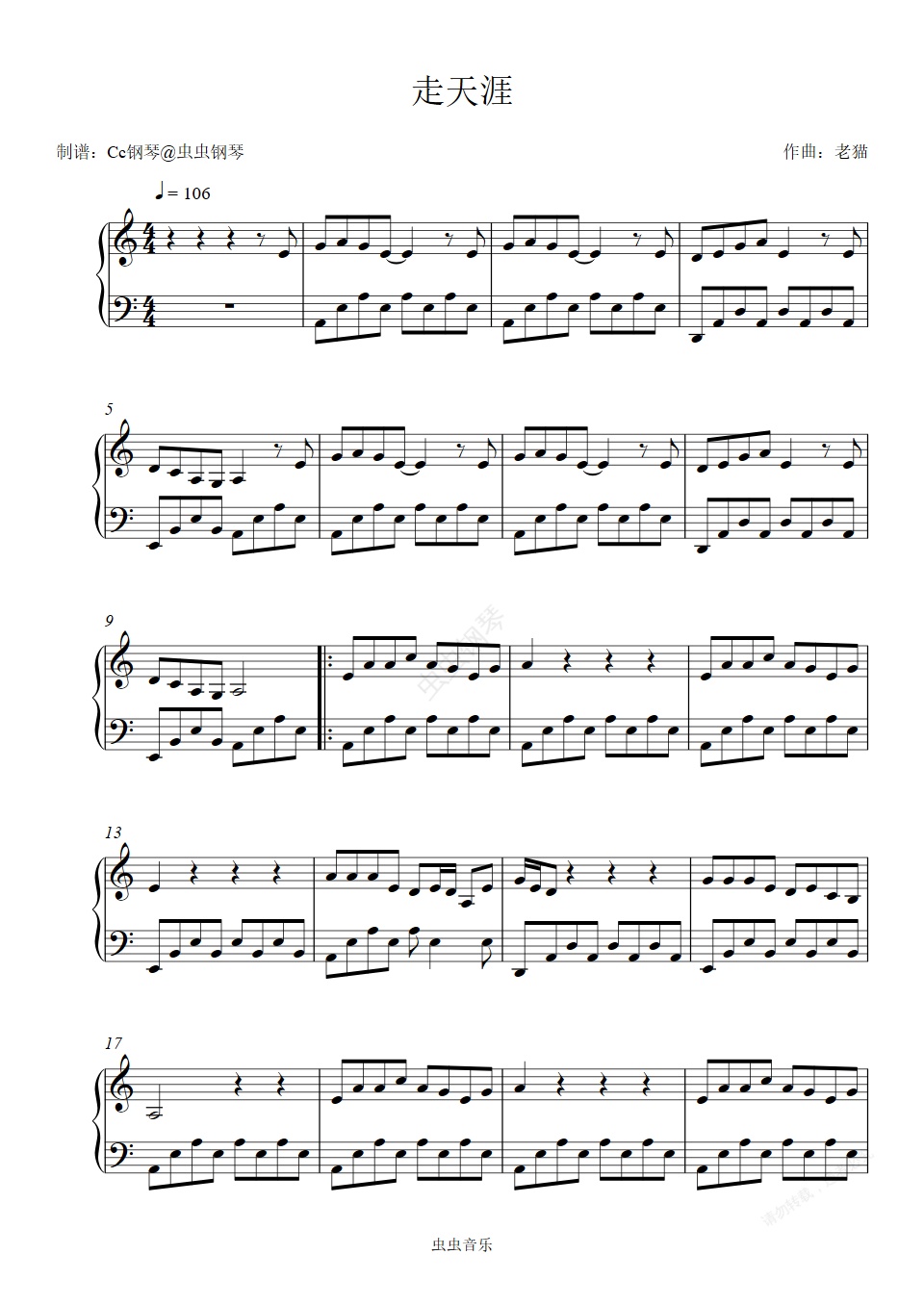 钢琴谱:走天涯 C调 好听易上手