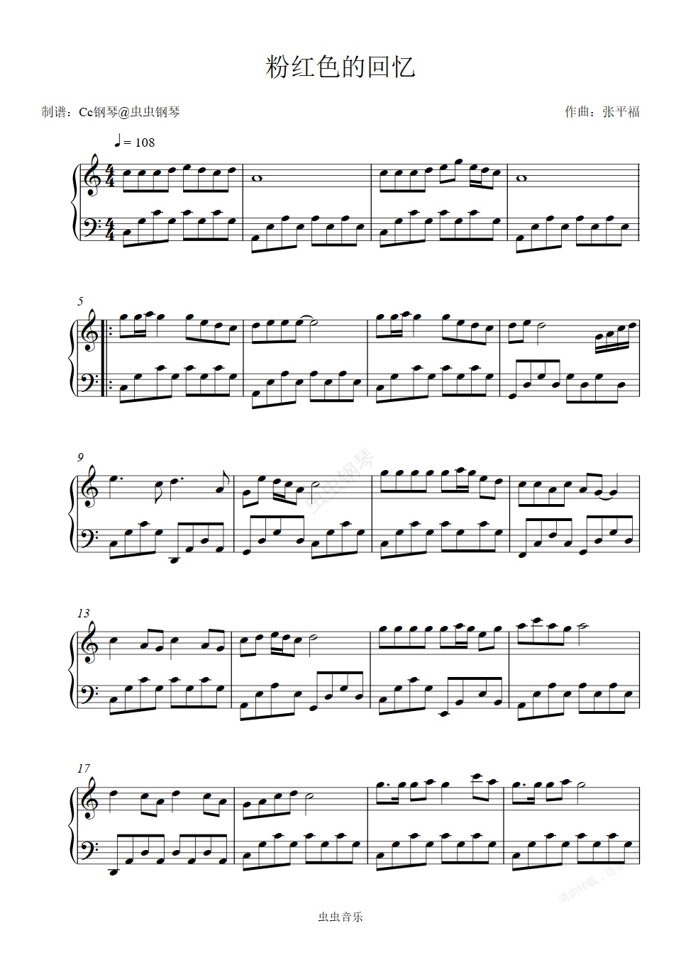 钢琴谱:粉红色的回忆 C调 好听易上手