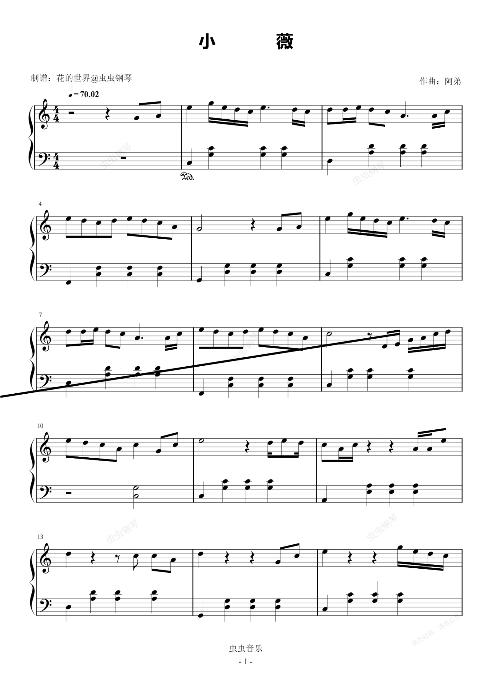 钢琴谱:小薇 C调简易版 黄品源 流行经典