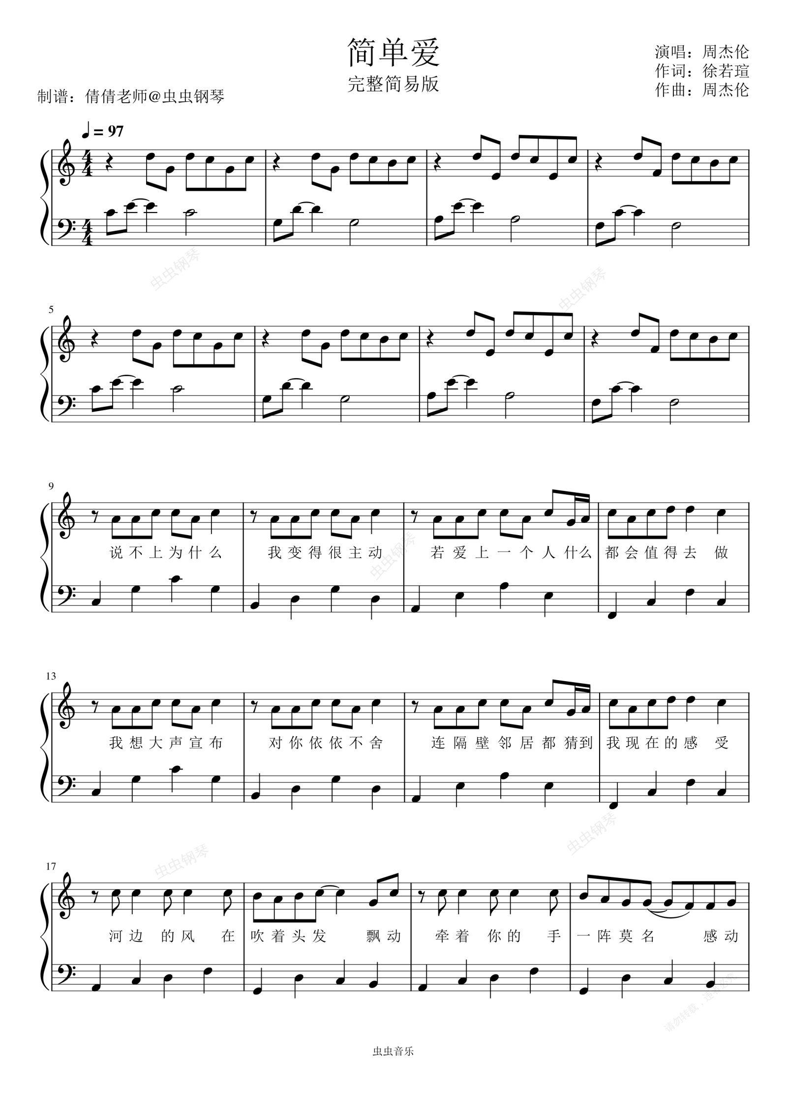 钢琴谱:简单爱-C调完整简单易版-周杰伦