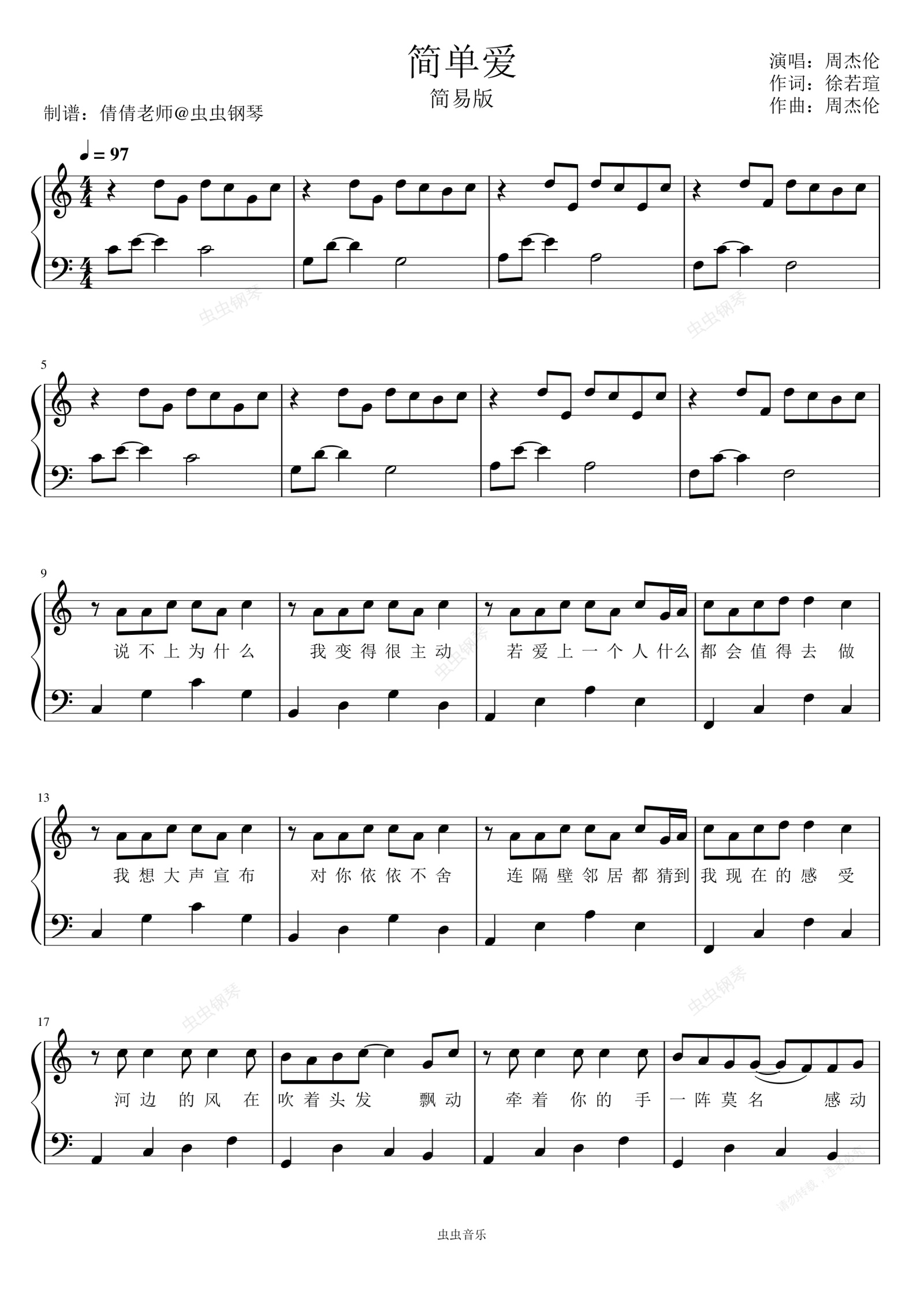 钢琴谱:简单爱-C调片段简单易版-周杰伦