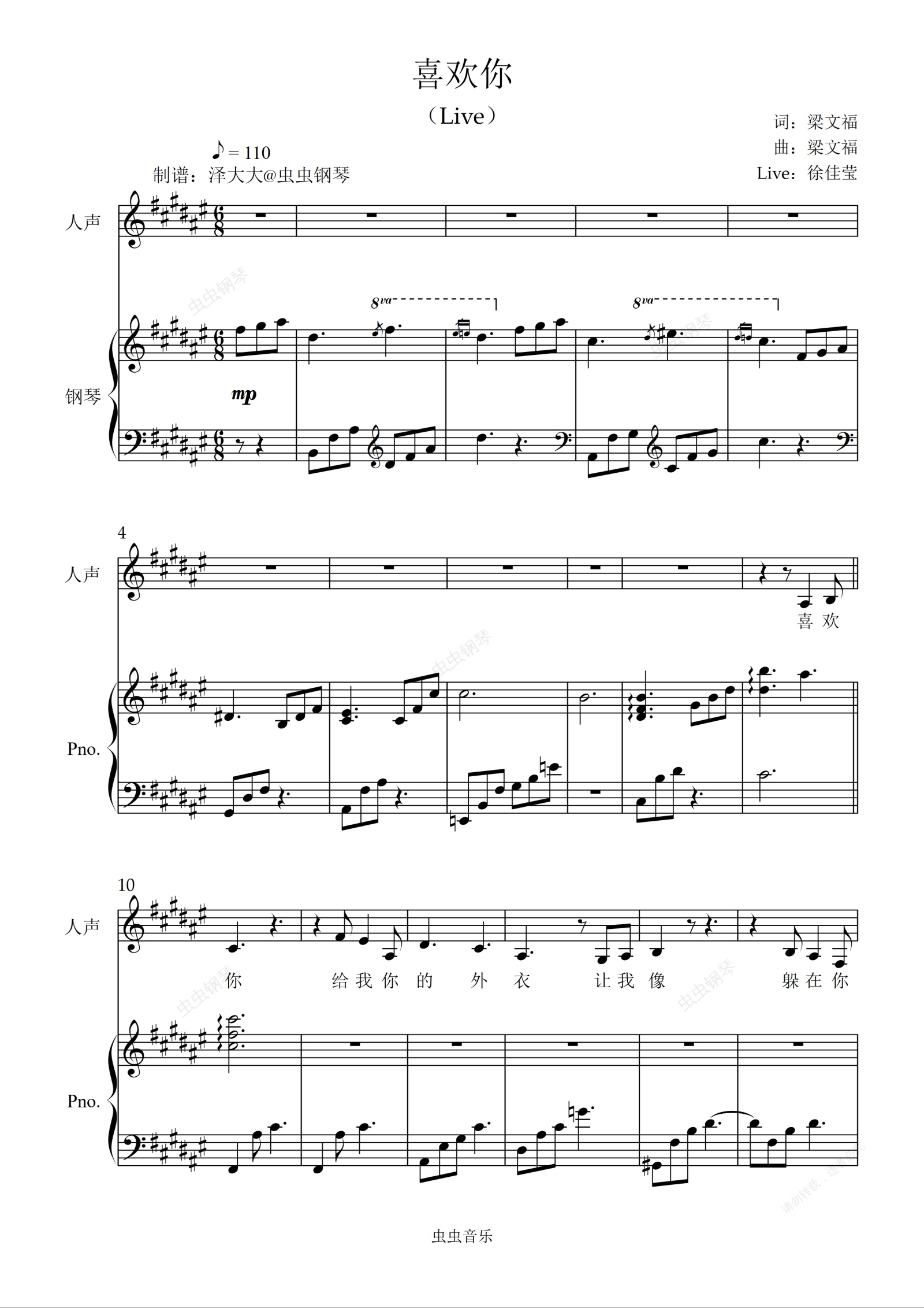 钢琴谱:喜欢你【我是歌手Live弹唱附词】泽大大 徐佳莹