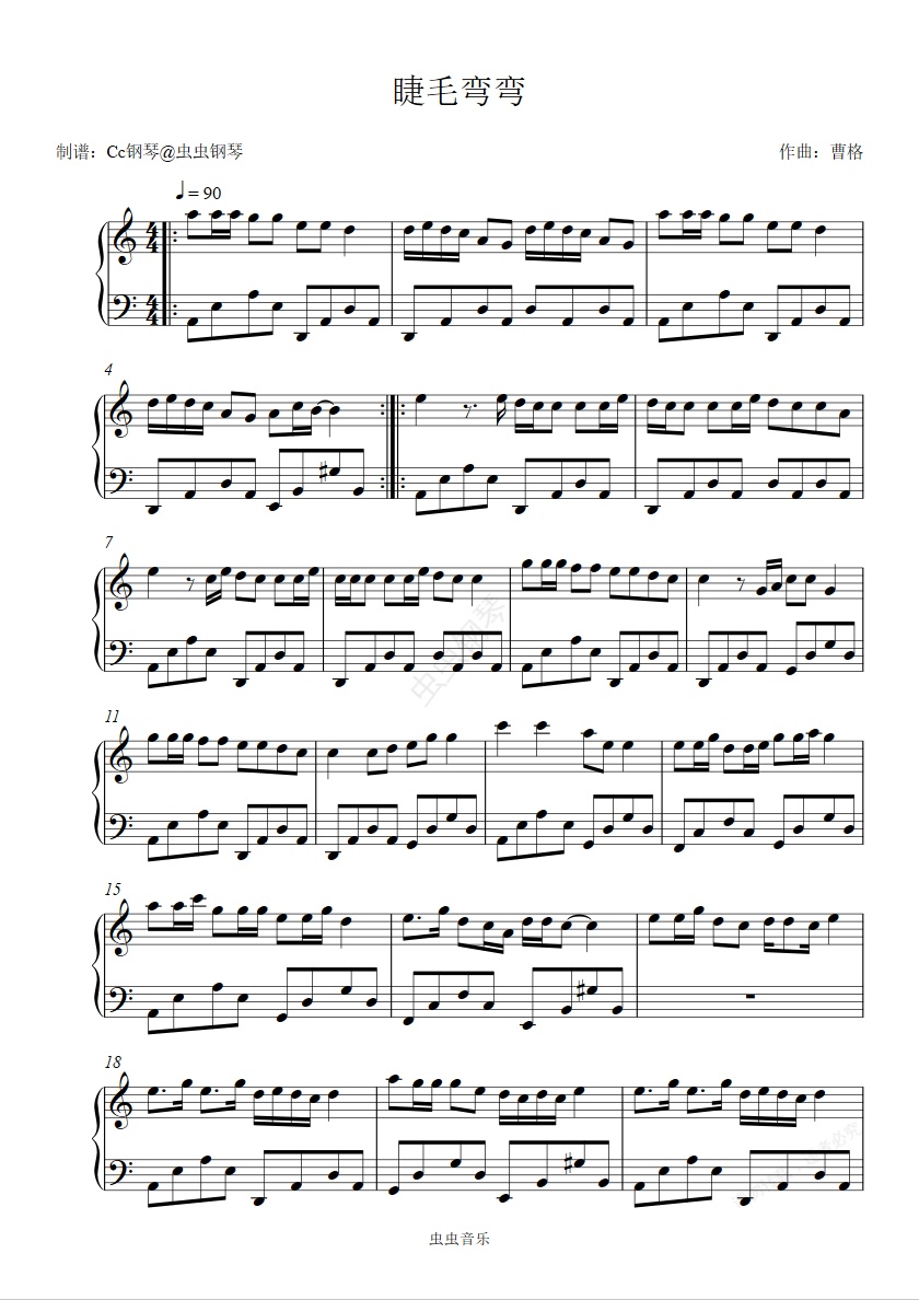 钢琴谱:睫毛弯弯 C调 好听易上手