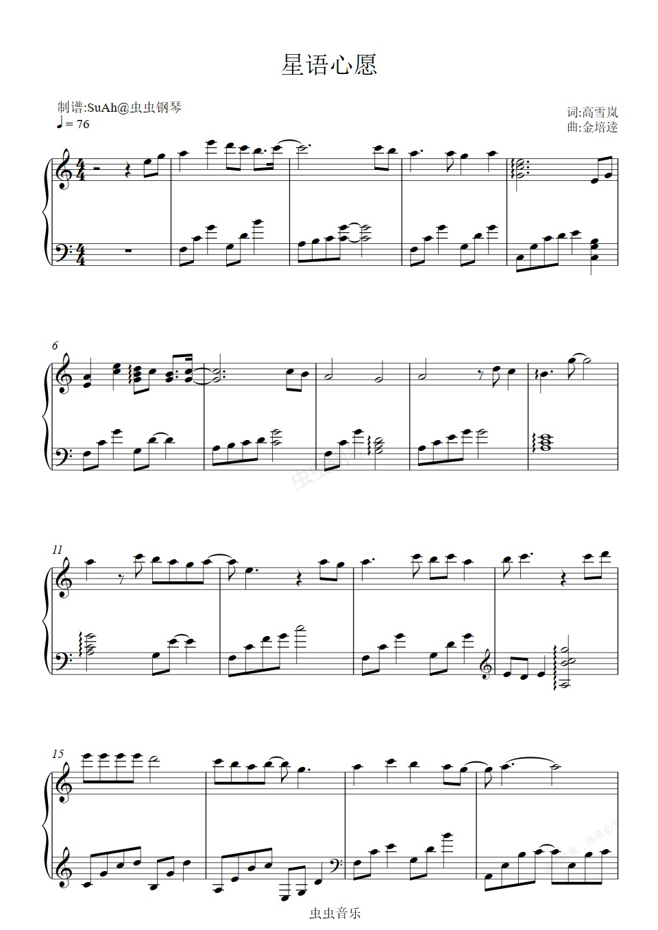 钢琴谱:星语心愿-张柏芝 C调简易钢琴独奏