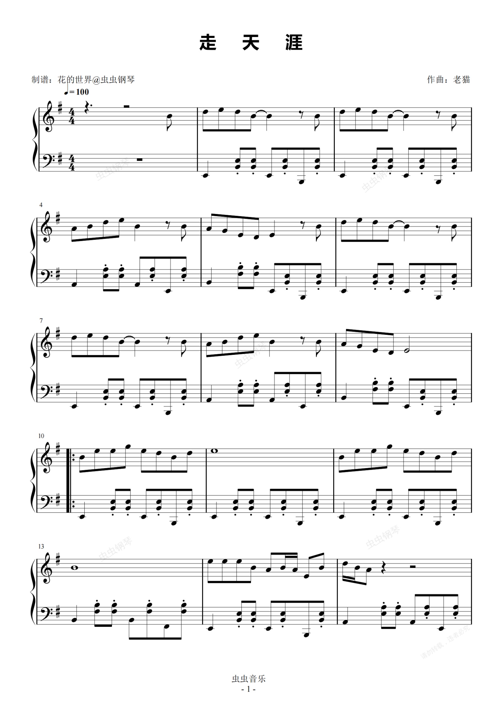 钢琴谱:走天涯 原调简易版 降央卓玛
