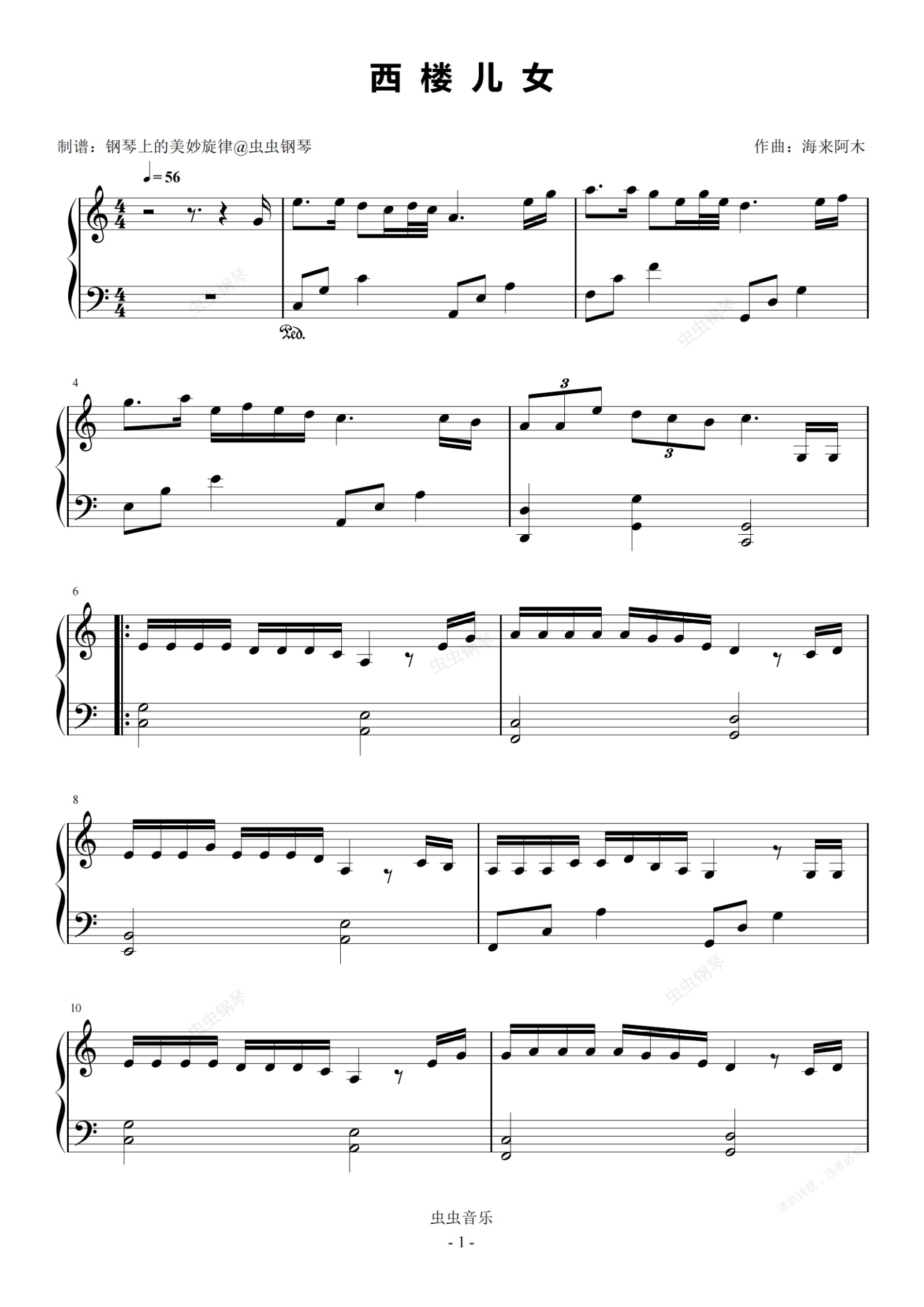 钢琴谱:西楼儿女 C调简易版 海来阿木