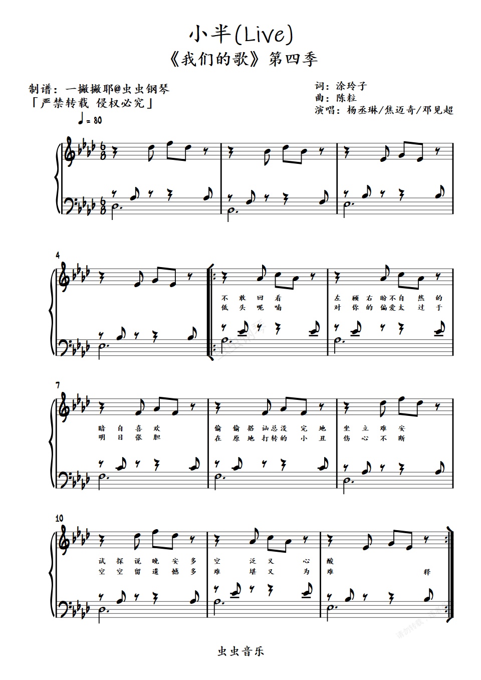 钢琴谱:弹唱伴奏谱《小半》杨丞琳/焦迈奇/邓见超《我们的歌》现场版「一撇撇耶」