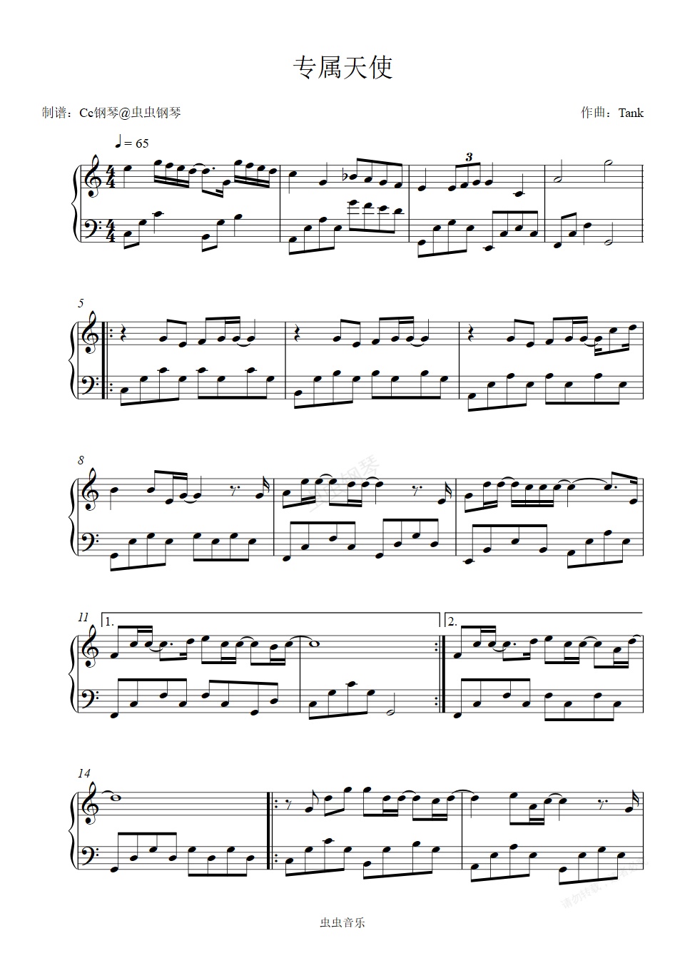 钢琴谱:专属天使 C调 好听易上手