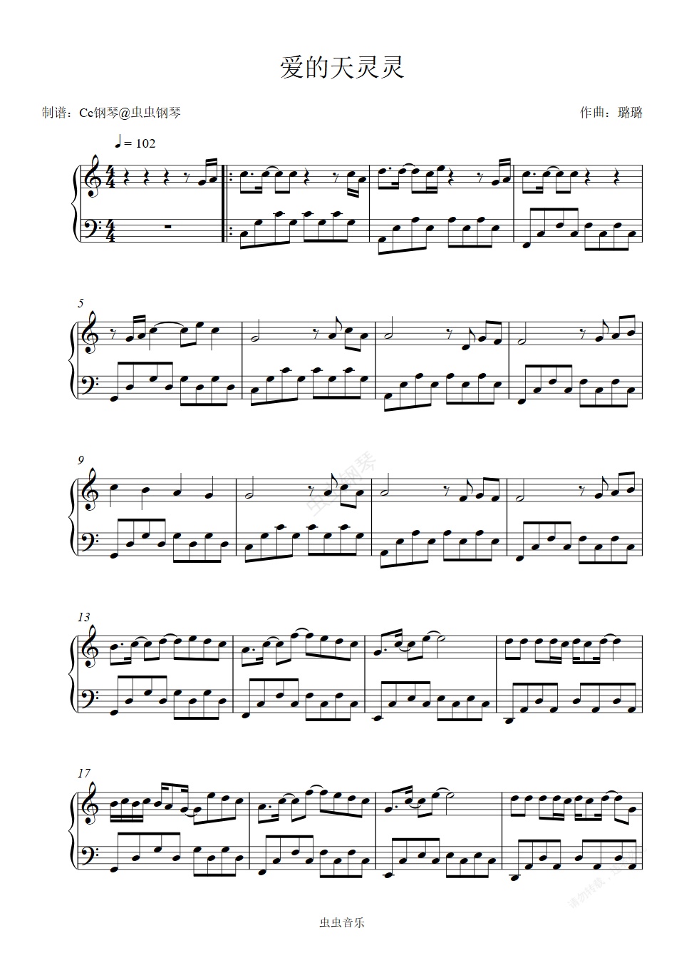 钢琴谱:爱的天灵灵 C调 好听易上手