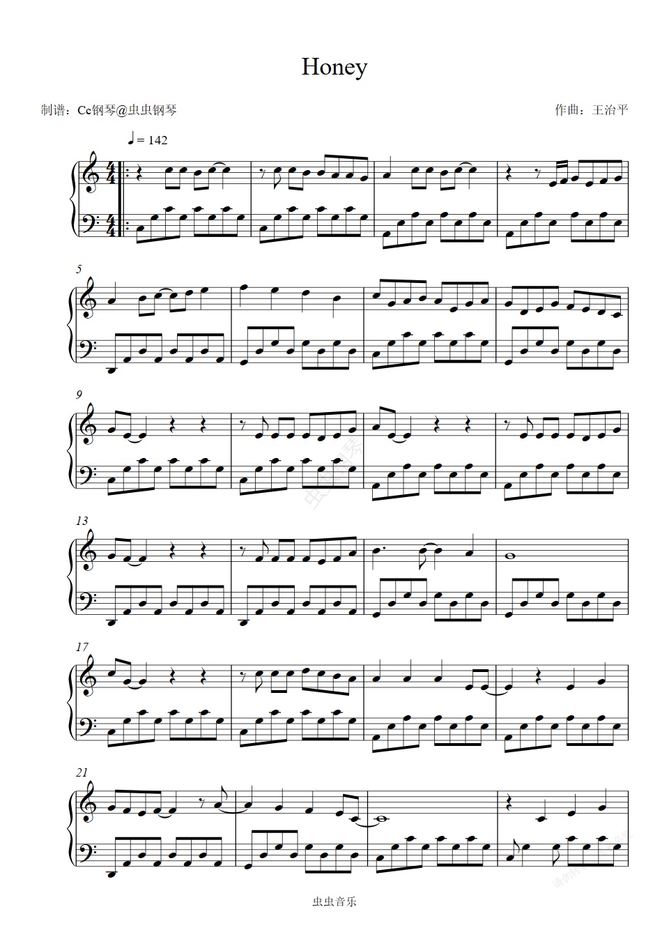钢琴谱:Honey C调 好听易上手