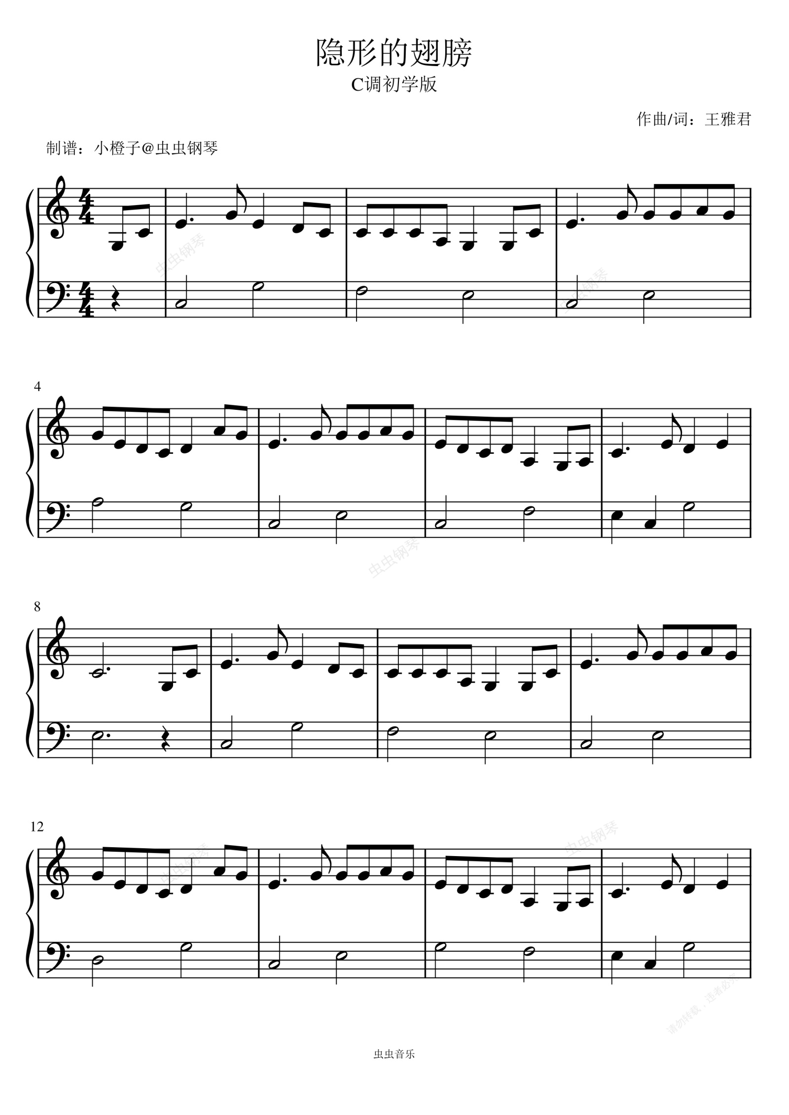 钢琴谱:⟪隐形的翅膀⟫C调简单版+小汤3难度
