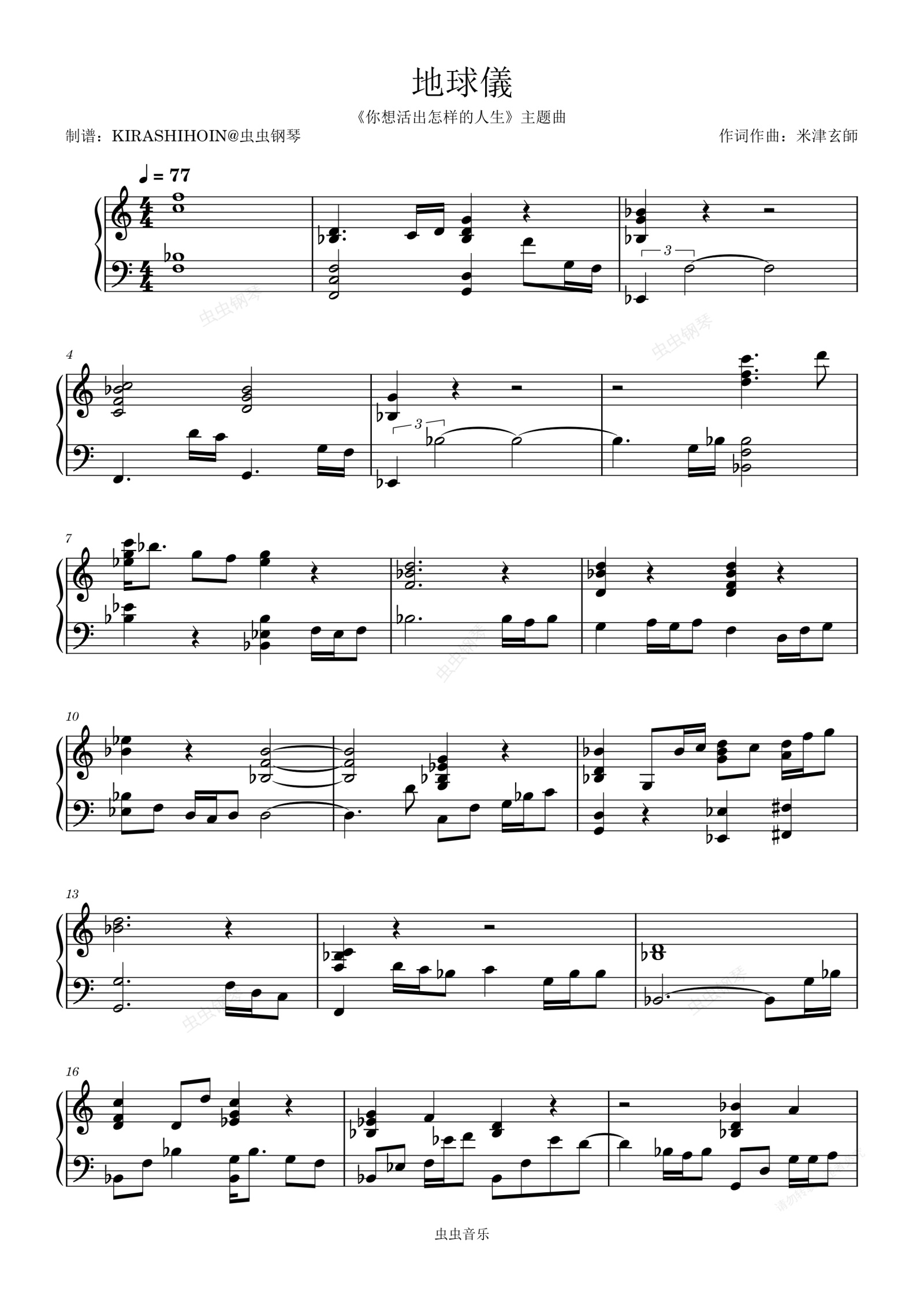 钢琴谱:地球儀 - Spinning Globe(《你想活出怎样的人生》主题曲)- 米津玄师