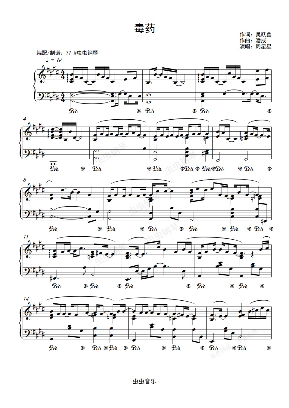 钢琴谱:Zealot周星星《毒药》钢琴独奏谱 原调