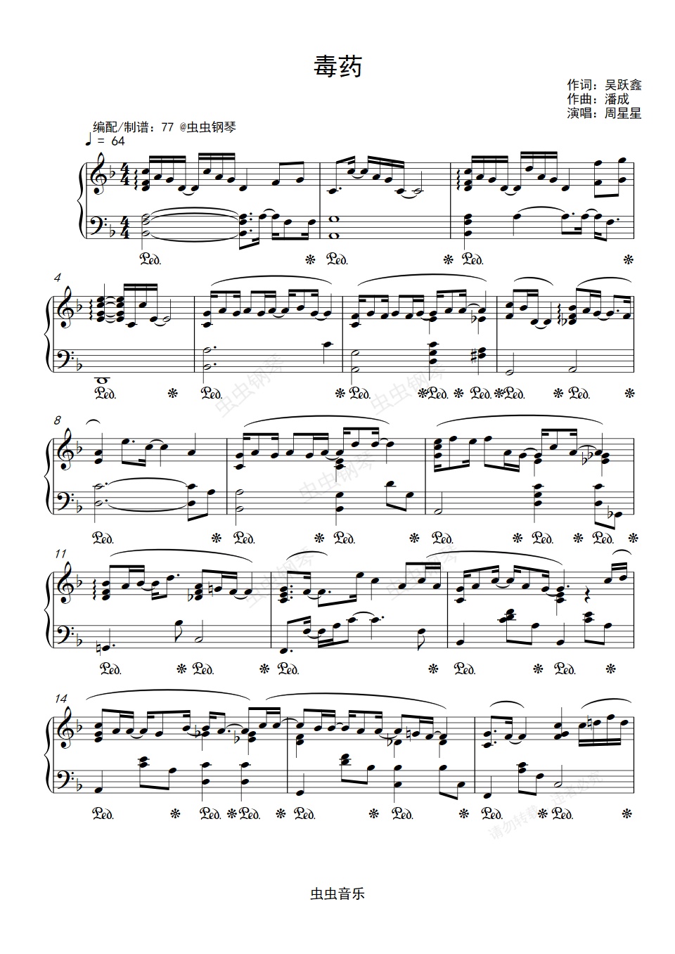 钢琴谱:Zealot周星星《毒药》钢琴独奏谱 F调