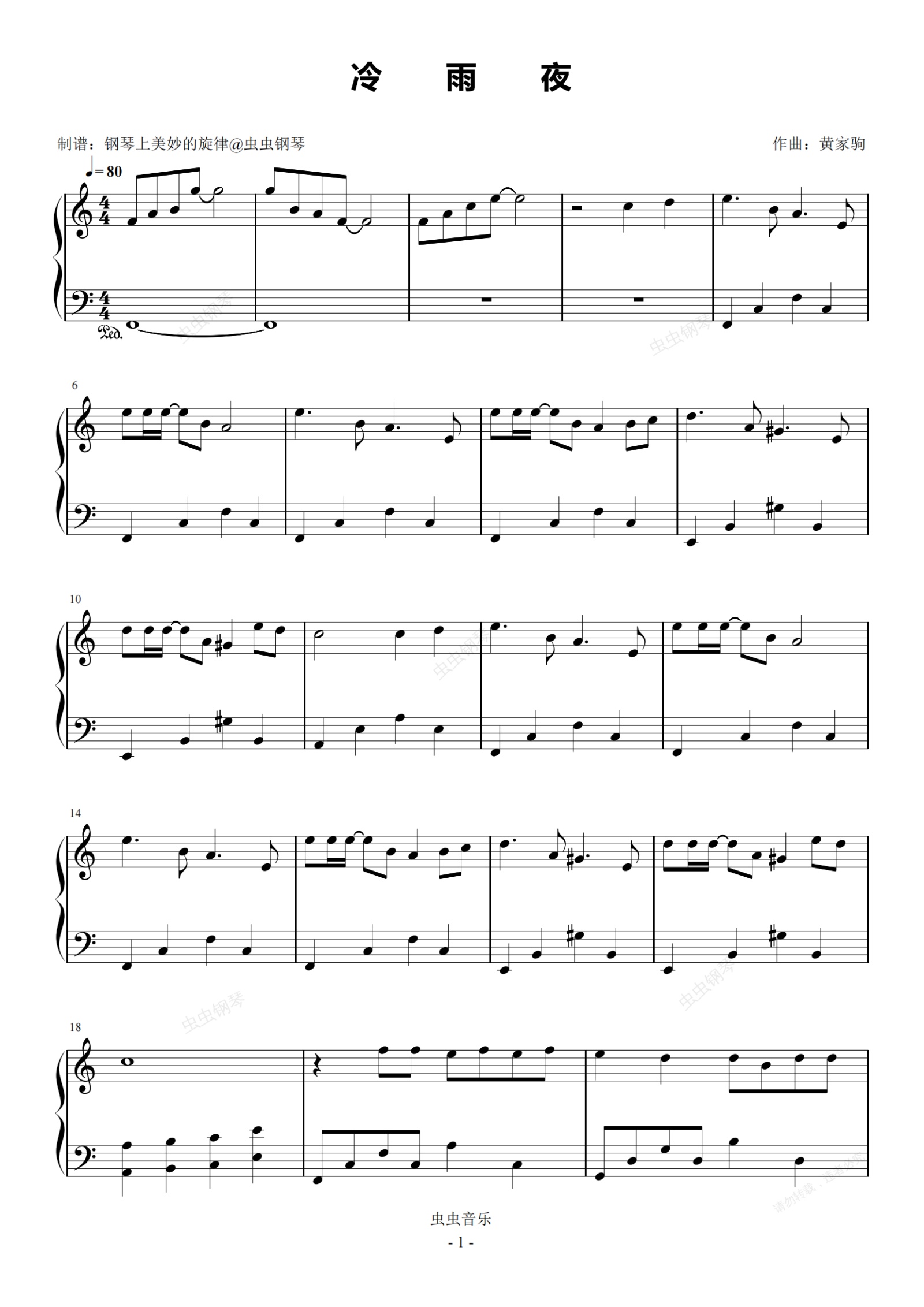 钢琴谱:冷雨夜 C调简易版 黄家驹 beyond 流行经典