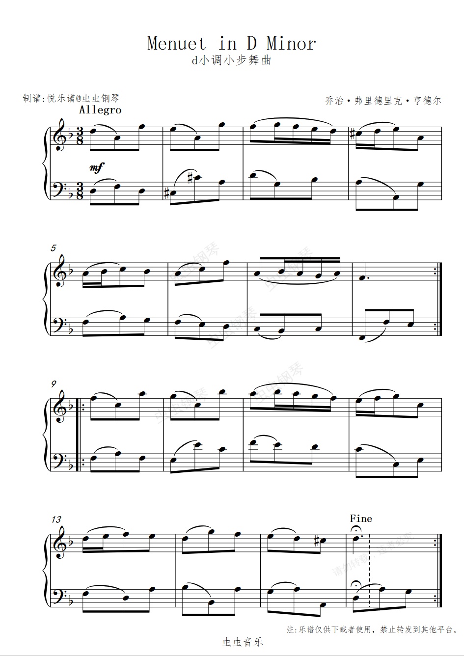 钢琴谱:d小调小步舞曲//Menuet in D Minor-免费乐谱【可爱】