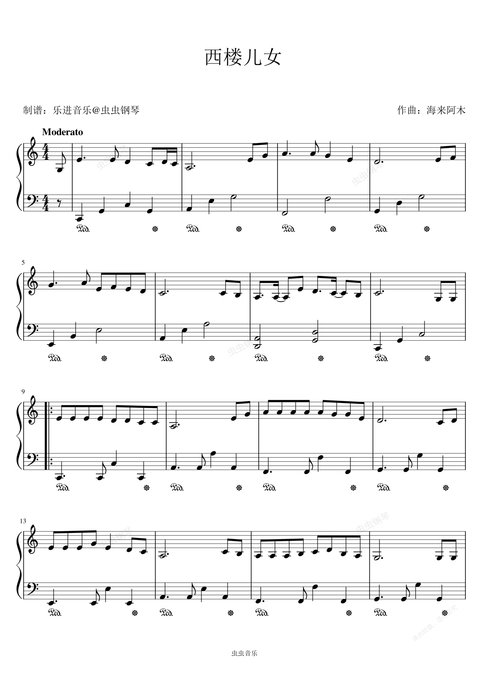 钢琴谱:《西楼儿女》C调简易版