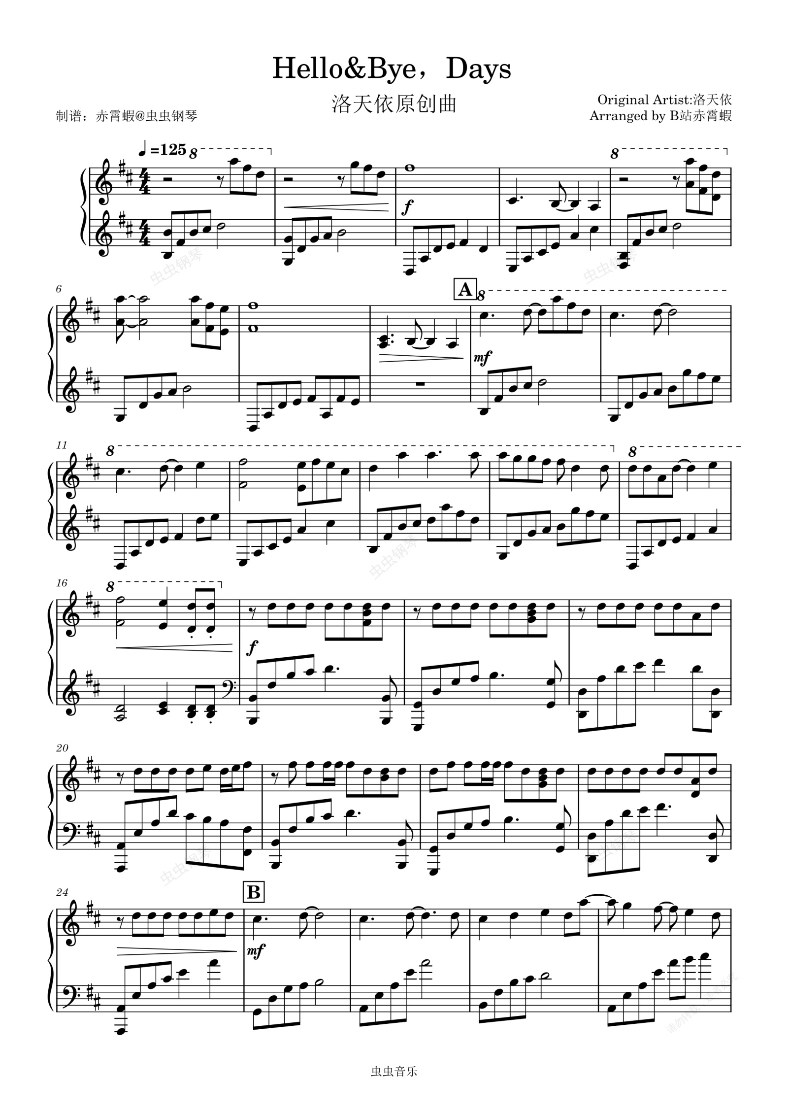 钢琴谱:Hello&Bye,Days—洛天依 D大调