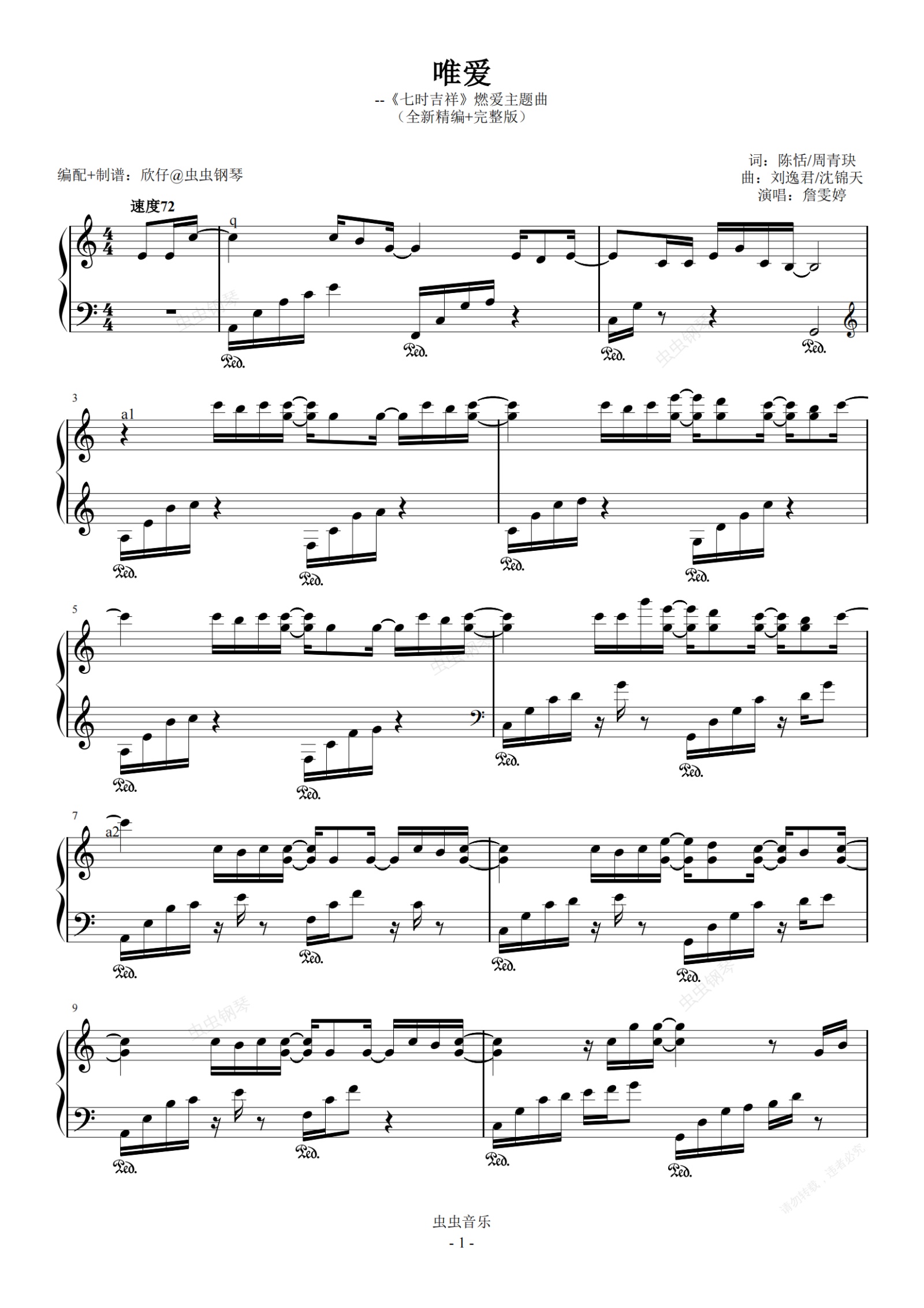 钢琴谱:詹雯婷-C《唯爱》(《七时吉祥》燃爱主题曲、完整版)