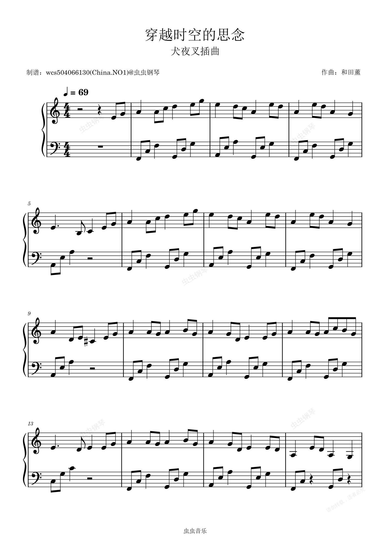 钢琴谱:《穿越时空的思念》-C调-简单好听版-犬夜叉插曲
