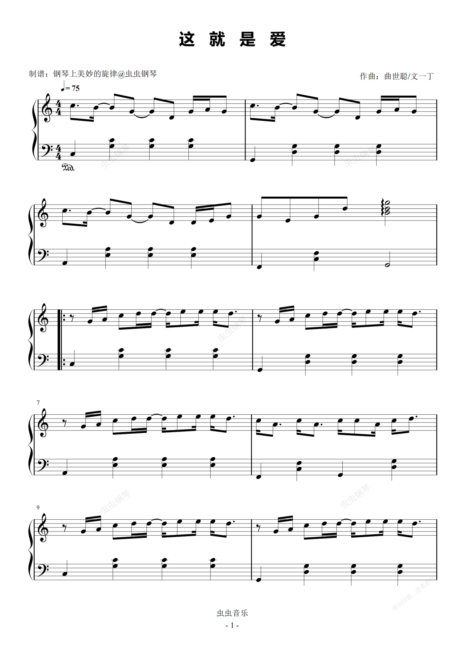 钢琴谱:这就是爱 C调简易版 张杰