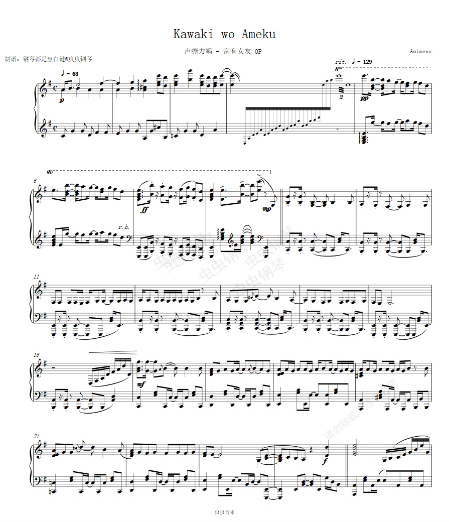 钢琴谱:【Animenz】声嘶力竭 - 家有女友 OP 【G调易弹】