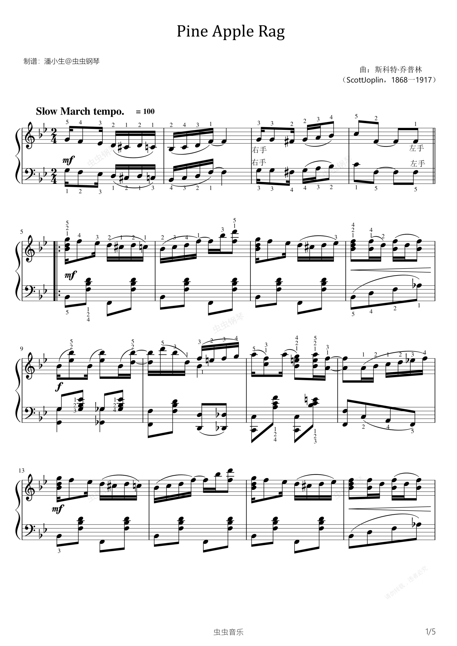 钢琴谱:Pine Apple Rag 原版带指法 斯科特·乔普林 Scott Joplin 爵士钢琴