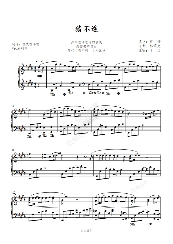 钢琴谱:猜不透 原调唯美版 丁当 吱吱编配