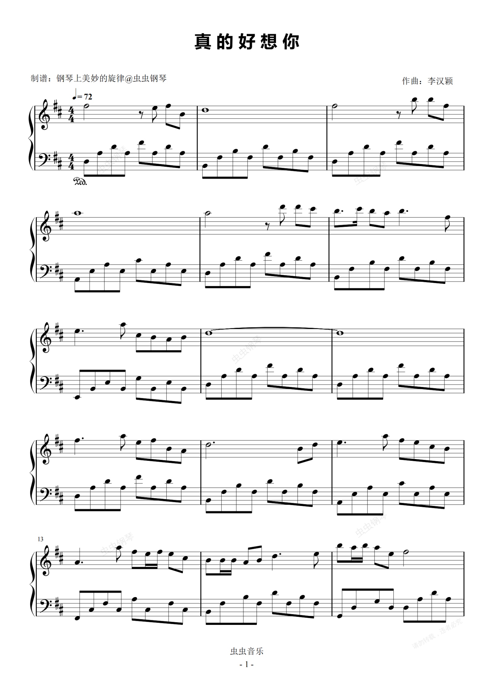 钢琴谱:真的好想你 原调简易版 周冰倩 流行经典